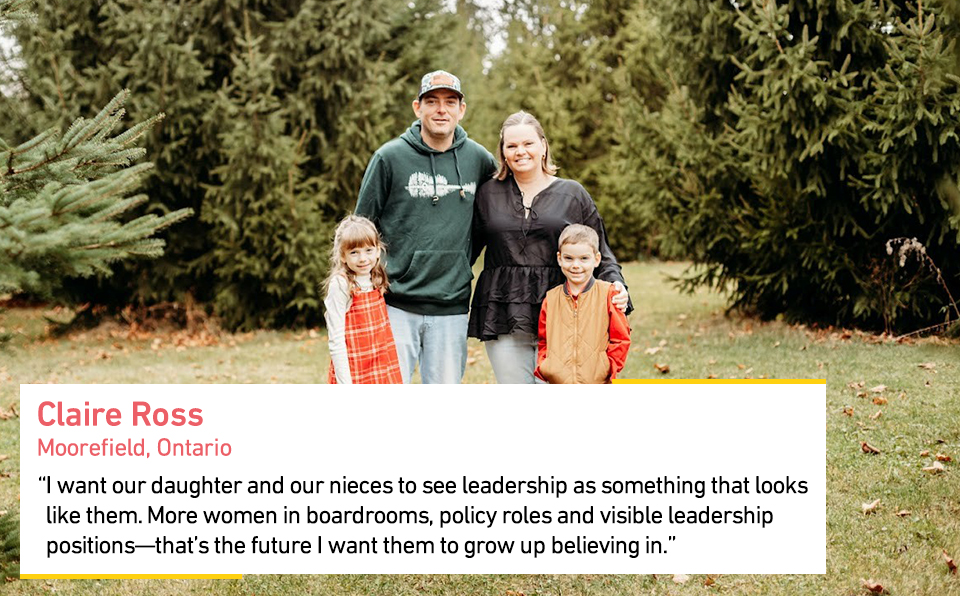 Claire bridges two worlds with passion and purpose, applying her skills as a French immersion teacher to educate the next generation about where their food comes from. On her family farm, she’s a hands-on egg, crop and turkey farmer. And in her community and industry, Claire serves as a regional councillor with Egg Farmers of Ontario. Her goal is to model strong female leadership, ensuring women have a seat at the table in shaping policy and the future of farming.